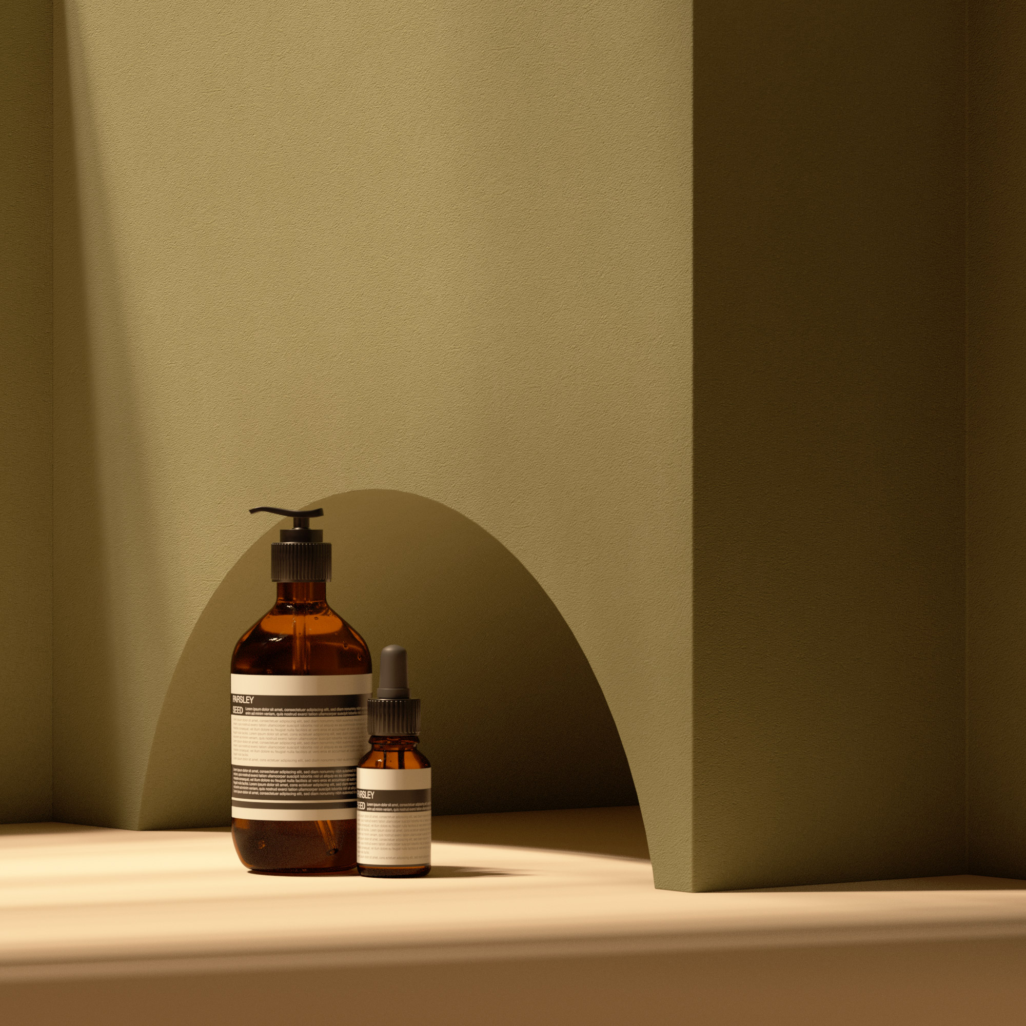 The concept for this series was to reverse engineer the aesthetic of Aesop and build upon it in Cinema 4D with Octane, aiming to achieve something teetering the line between photo realism and something slightly altered, or muted in such a way that it would be consistent with the brands calming mood. This meant dialing down reflections and playing with variations of backlighting products to alter what might be the default information received in a photograph and taking it somewhere slightly different in subtle ways.